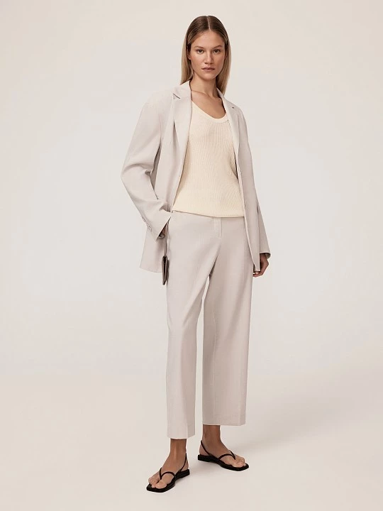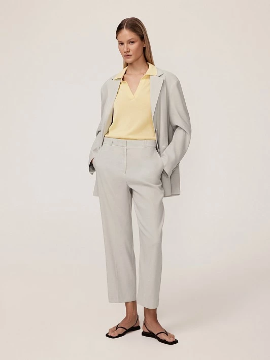 Джемпер в современном минималистичном стиле — сочетание лаконичности и универсальности. Простой, но утилитарный дизайн делает его подходящим для различных ситуаций благодаря множеству возможных сочетаний. Модель выполнена из премиальной итальянской пряжи на основе нежной вискозы, демонстрирующей деликатный блеск. Вискоза обеспечивает легкость, мягкость и приятные тактильные ощущения, делая джемпер комфортным для носки. Блеск пряжи подчеркивает премиальность изделия. Использование современной японской плосковязальной машины Shima Seiki 15 класса вязки гарантирует тонкость и высокое качество вязаного полотна, что делает джемпер долговечным, устойчивым к деформации и приятным к телу. Нежный молочный цвет джемпера подчеркивает естественную красоту и легко сочетается со всеми оттенками весенне-летней коллекции, делая его универсальным элементом гардероба. Крой джемпера подчеркивает его минималистичный стиль: глубокий круглый вырез создает аккуратный и сбалансированный силуэт, подчеркивая зону декольте. Короткий рукав обеспечивает удобство и свободу движений, добавляя образу непринужденности и делая джемпер идеальным в качестве первого слоя. Цельновязаная основа обеспечивает отсутствие боковых швов, что делает джемпер более комфортным и долговечным. Ручная кетлевка подчеркивает качество модели, обеспечивая аккуратность и долговечность изделия. Такая модель - это сочетание стиля, комфорта и качества.
