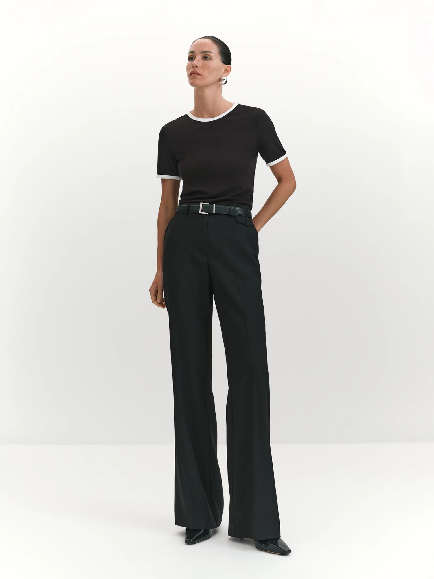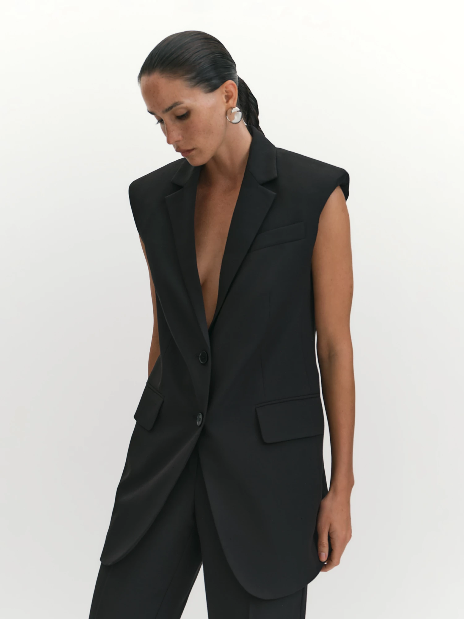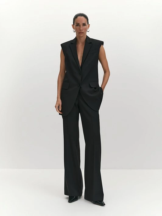 Выполнили жилет по силуэту и деталям похожим на мужской пиджак, что сделало его невероятно актуальным и вывело костюм в уверенном черном на новый уровень. Акцент на плечах и клапаны функциональных карманов, вкупе с полуприлегающим силуэтом, визуально формируют "песочные часы". Глубокий V-вырез, оформленный с помощью английского воротника, а также дизайнерский срез борта придают необходимое вертикальное направление модели. Часовой карман с листочкой и шлица - в поддержку мужского стиля. Общий крой жилета позволяет носить его без рубашки и использовать в вечерних образах, дополняя брюками из такой же ткани или экспериментируя с цветом и фактурами. Высокотехнологичная вискозная ткань отлично подходит для костюмной группы, она тактильно приятна, хорошо пропускает воздух и устойчива к износу, а стильный черный уместен в любой ситуации и притягивает взгляды.