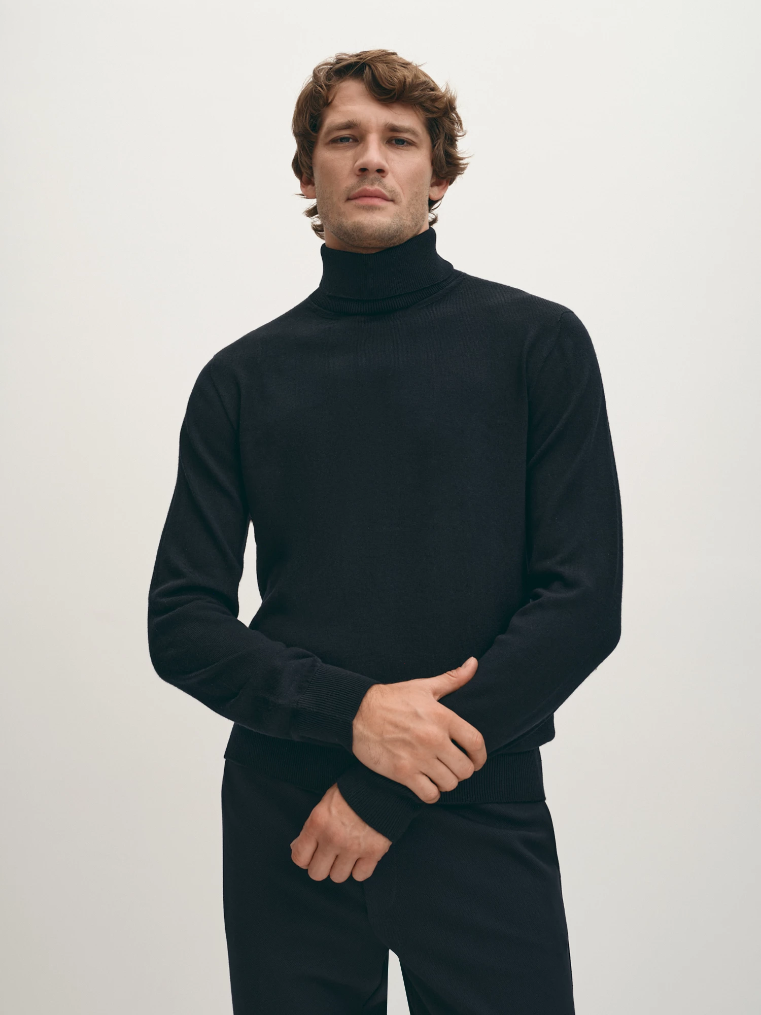 Универсальная вязаная водолазка тёмно-синего оттенка. Шерсть мериноса в составе надёжно сохраняет тепло, фирменная эластичная вязка обеспечивает комфортную посадку по фигуре. Модель прямого силуэта, с естественной линией плеча и длинным втачным рукавом. Воротник-стойка с отворотом, манжеты на рукавах и манжет по низу изделия - в мелкий фактурный рубчик. Уютная водолазка дополнит как лук в стиле кэжуал, так и нестрогий деловой образ.