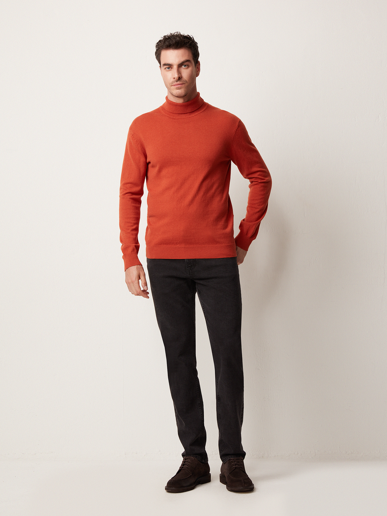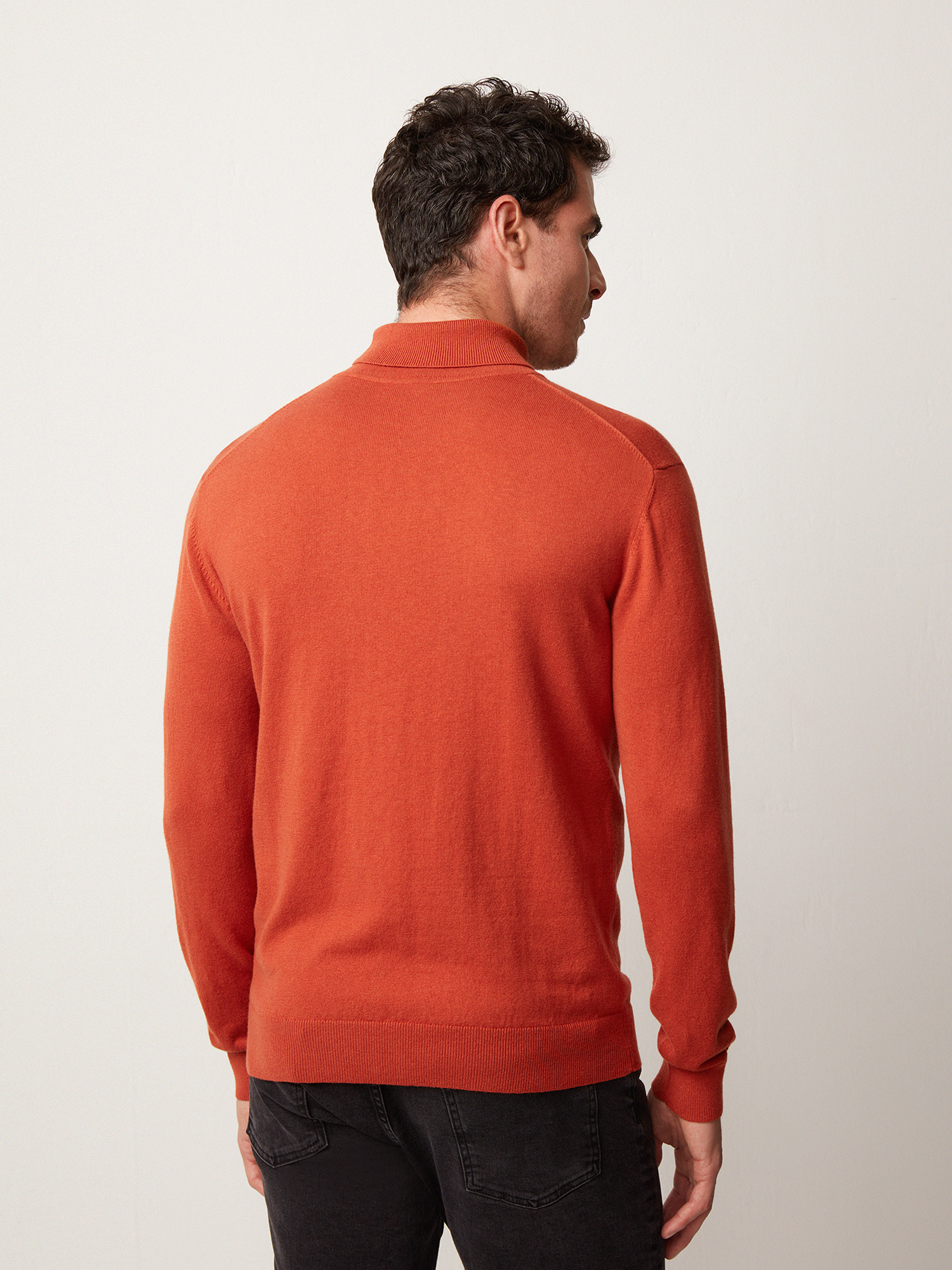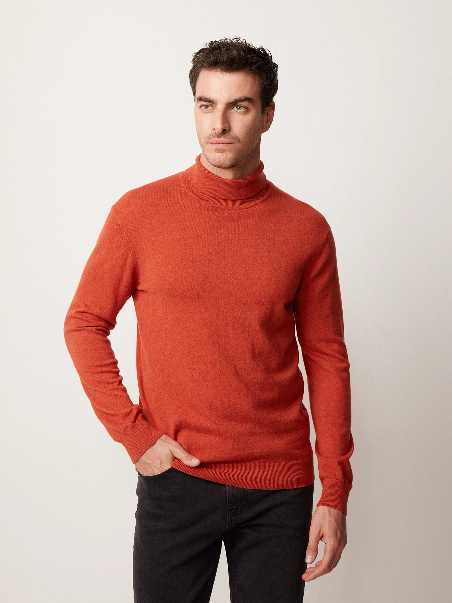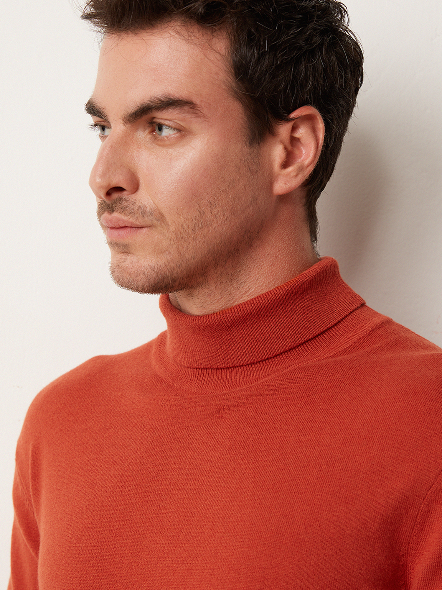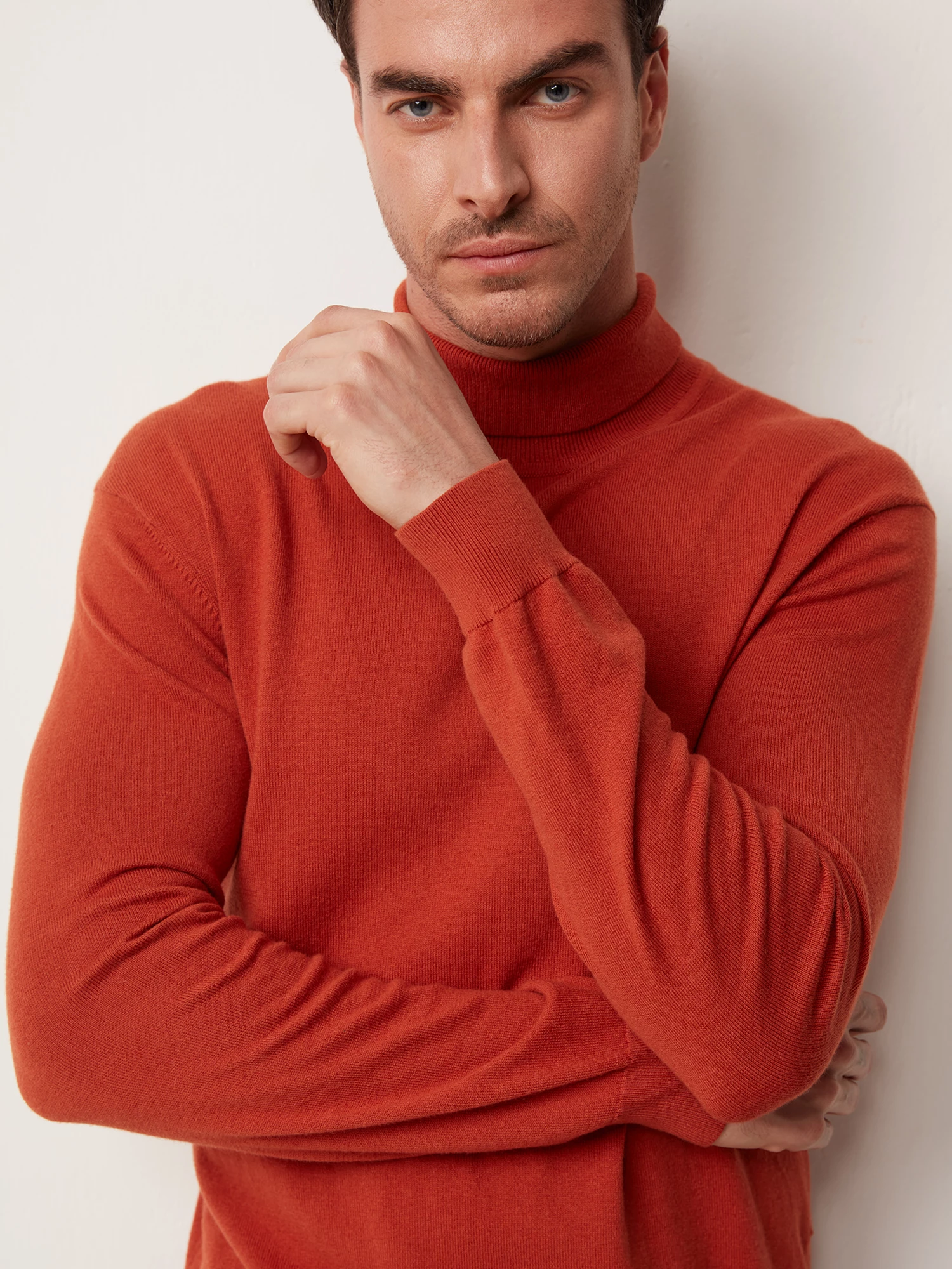 Яркая вязаная водолазка насыщенного оранжевого цвета. Выполнена из фирменной пряжи на основе хлопка с добавлением шерсти мериноса. Модель прямого силуэта, с воротником-стойкой с отворотом и длинным втачным рукавом. Манжеты на рукавах, воротник и манжет по низу изделия оформлены подвязом. Водолазка в стиле смарт-кэжуал станет альтернативой привычным свитерам и лонгсливам.