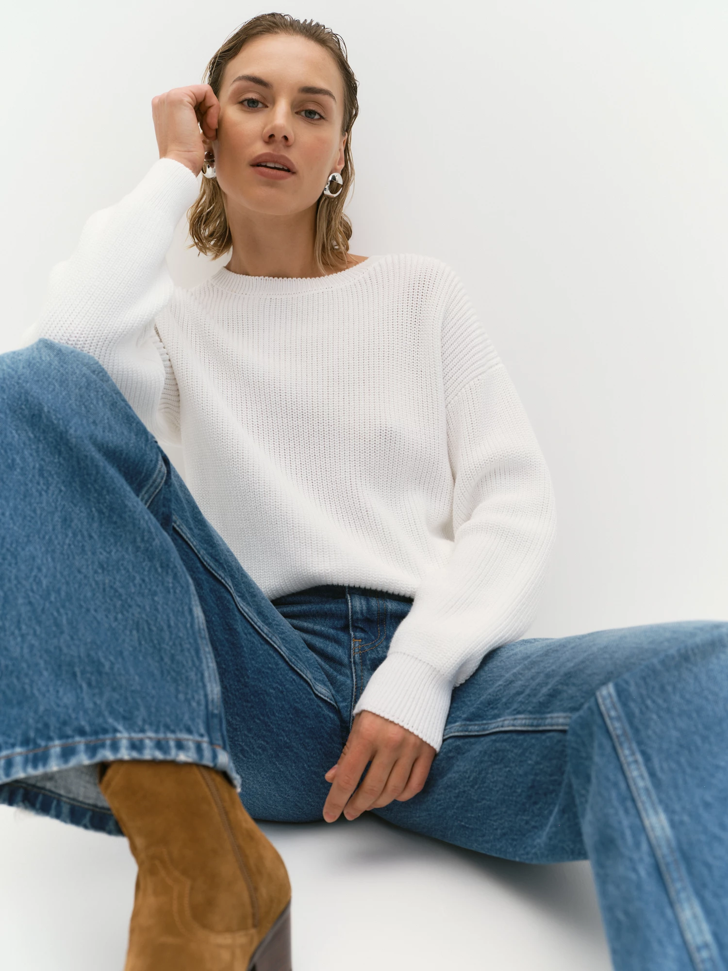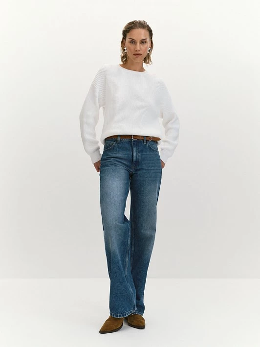 Лаконичный вязаный джемпер из натурального хлопка выполнен с круглым вырезом и втачным рукавом со спущенным плечом. Выбрали для базового свитера пряжу российского производства и фактурное переплетение полуфанг. Горловина, низ изделия и манжеты связаны резинкой. Детали джемпера вывязаны точно по лекалу на японской плосковязальной машине Shima Seiki, а значит он будет хорошо держать форму и долго прослужит. Соединительные швы выполнены на специальном кеттельном оборудовании, позволяющем проводить премиальную эластичную обработку. Базовый белый сдержан и лаконичен, джинсы regular rise средней варки DJ0173XY1 добавят кэжуальности образу с джемпером.