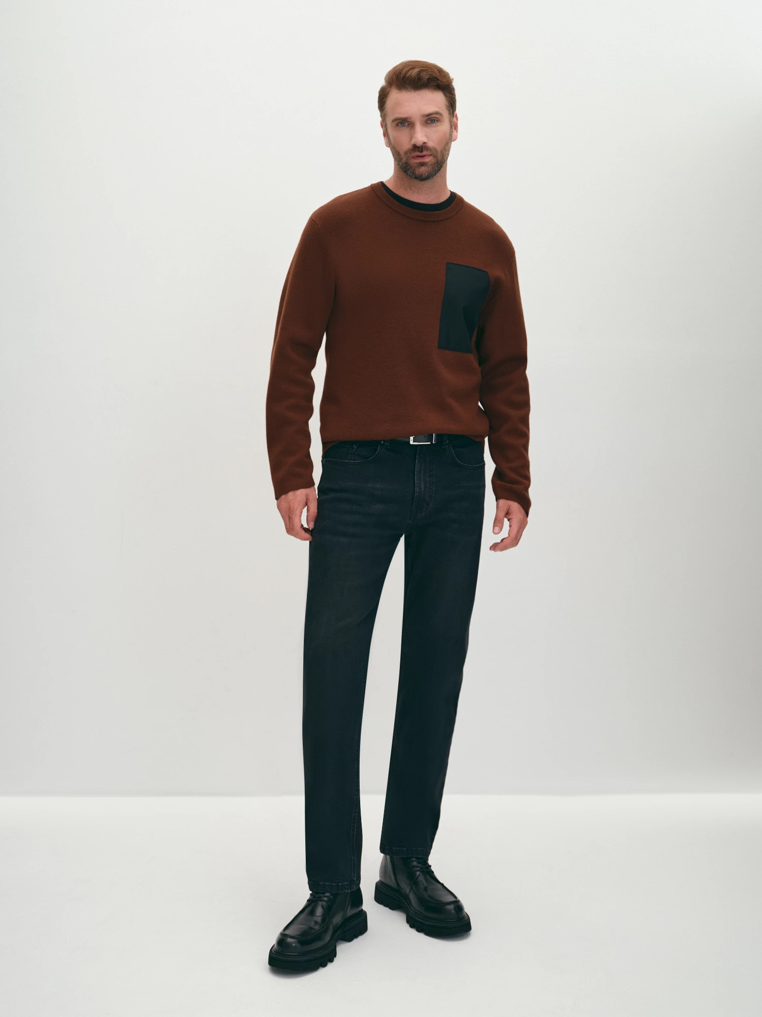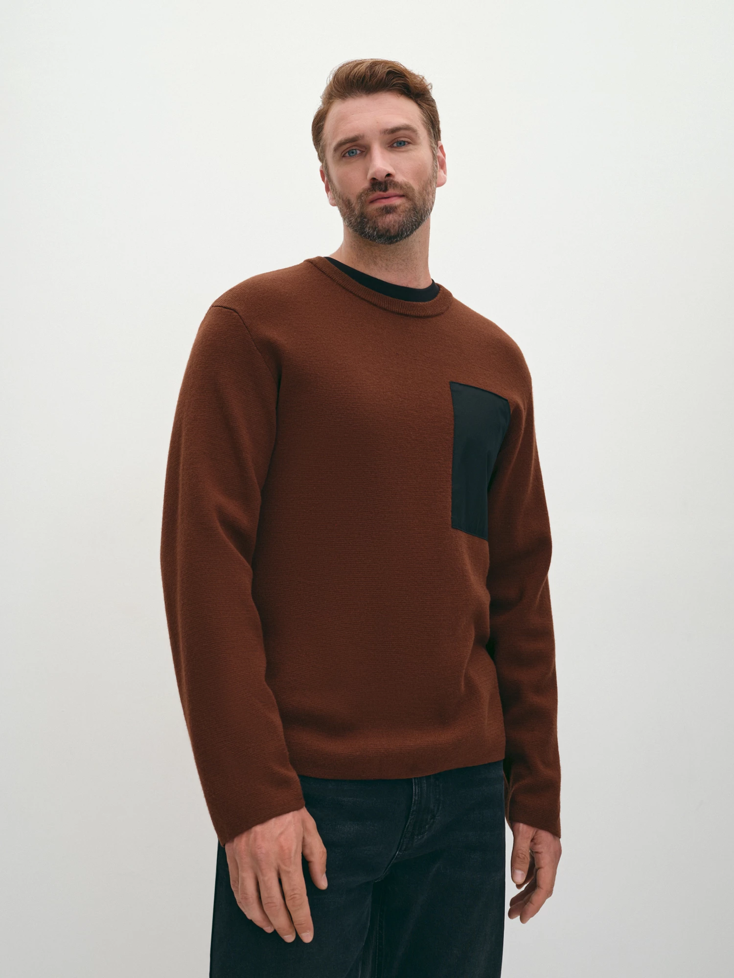 Лаконичный джемпер с круглым вырезом и длинным рукавом декорирован нагрудным карманом из плащевки со скошенным краем для придания неформальности образу. Модель выполнена в технике "жаккард" на японской плосковязальной машине Shima Seiki из пряжи с теплой шерстью мериноса. Вязаные изделия из шерсти мериноса обеспечивают комфортную температуру для тела, хорошо тянутся и не сковывают движения. Качественной пряже соответствует премиальная обработка - все соединительные швы выполнены на кеттельной машине - это ценная обработка без потери эластичности. Теплый, однотонный, в благородном коричневом, свитер подойдет для деловой встречи, офиса, школы, прогулки, встречи с друзьями.
