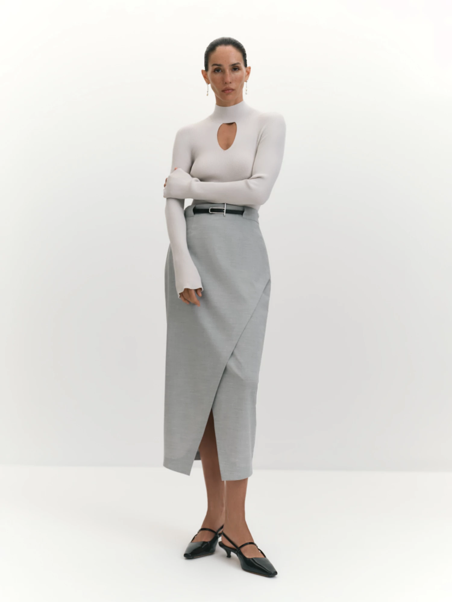 Цельновязаный джемпер эффектно облегает, подчеркивая достоинства фигуры. Расклешенный книзу рукав актуален и дает ощущение уюта. Благодаря прикетлеванной, то есть присоединенной эластичным швом "петля в петлю", стойке горловины впереди образуется оригинальный вырез, который подчеркивает зону декольте и уравновешивает пропорции изделия. Джемпер цельновязаный - это значит, что он не имеет боковых швов и швов на рукавах, будет хорошо держать форму и долго прослужит. Изделие с переплетением нитей "рибана" выполнено на современной японской плосковязальной машине Shima Seiki из мягкой вискозной пряжи. Светлый жемчужный оттенок является базовым и универсальным в сочетаниях. Выбор наших стилистов - образ с юбкой из мягкой сетки с эффектом гофре SK0166K7.
