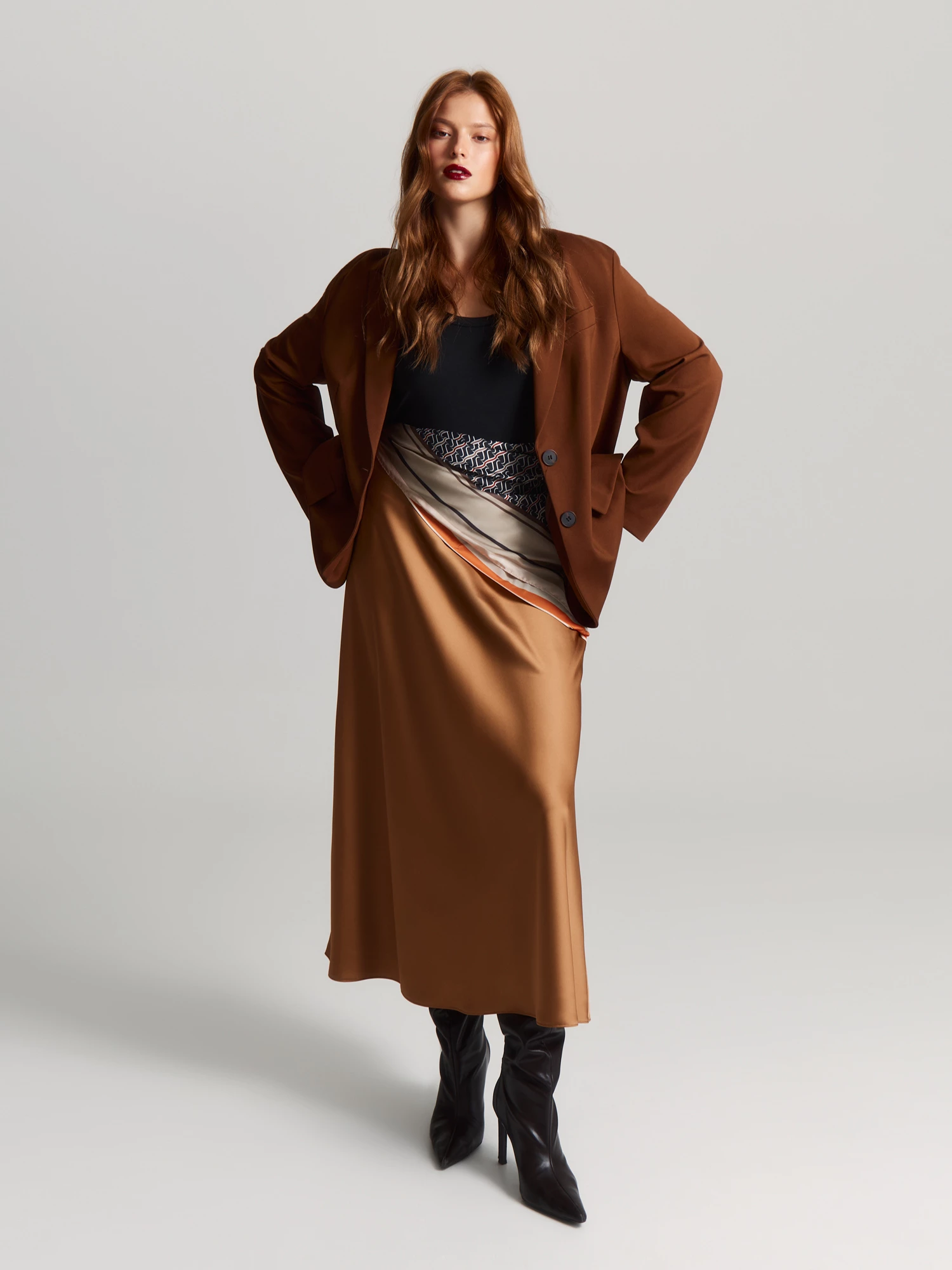 Эффектная юбка длины миди мягко струится и приятно облегает фигуру. Модель А-силуэта с кроем по косой создает элегантный силуэт, а потайная молния на талии обеспечивает аккуратную посадку.