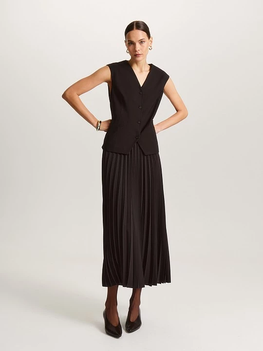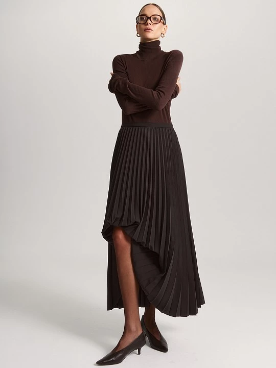Юбка с радиальным гофре, выполненным на ткани из качественной поливискозы в насыщенном шоколадном оттенке. Операция "гофре" выполнена с помощью специального оборудования на собственном производстве полного цикла. Модель хорошо подчеркивает талию, так как выполнена на притачном поясе с застежкой на потайную молнию сбоку. Геометрически верное, радиальное гофре с расширяющимися книзу складками гарантирует правильное расклешение и не увеличивает бедра.