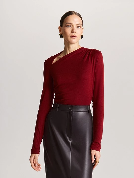 Для юбки выбрали плотную, шоколадного цвета экокожу с деликатным блеском и дополнили ее подкладкой для лучшей посадки. Такое полотно хорошо держит тепло и заданную форму.