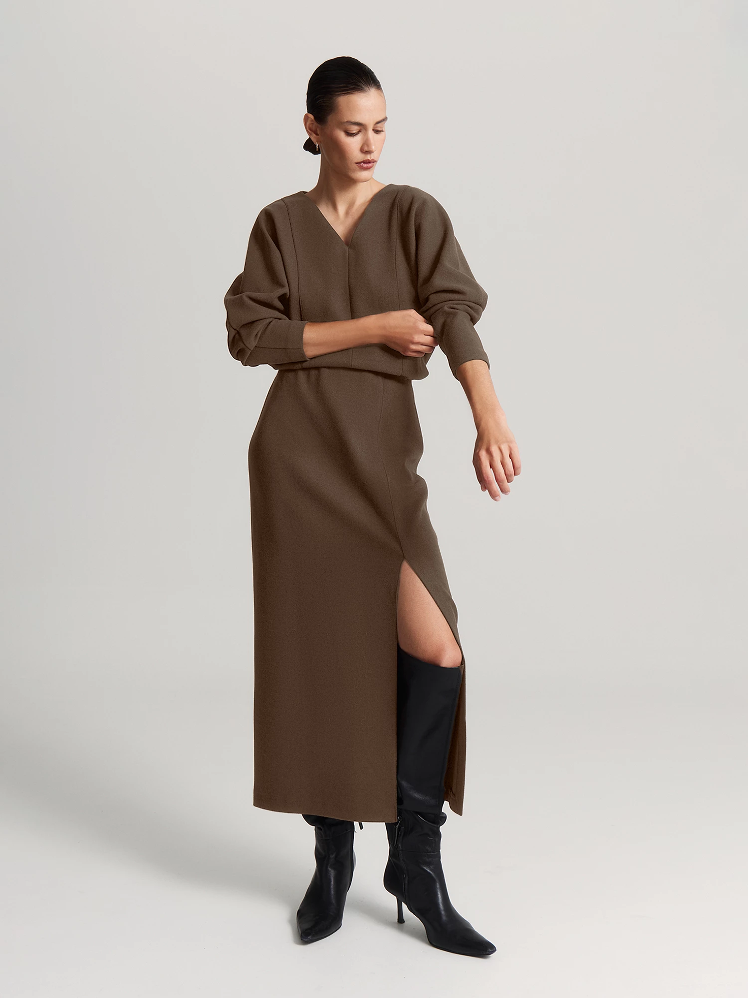 Насыщенный оттенок «шоколадный мартини» выглядит благородно и сочетается с блузой BL1697K, лонгсливами и джемперами коллекции.