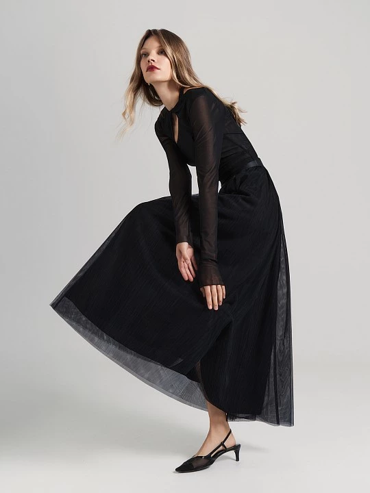 Юбка из сетки вышла на новый уровень актуальности в длине макси. Серьезная и скромная, с подкладкой почти до самого низа, она остается невероятно воздушной.