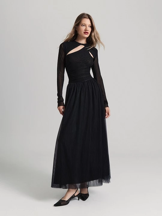 Резинка по талии обеспечивает удобную посадку, а длинный подъюбник из вискозы добавляет комфорт. Сетка без подгиба с сырым срезом подчеркивает современный стиль.