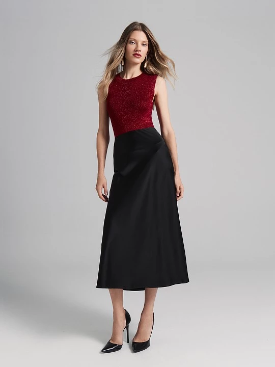 Юбка А-силуэта сшита из гладкой атласной ткани. Такое полотно хорошо держит форму, мягко переливается на свету и красиво ложится при расклешении.