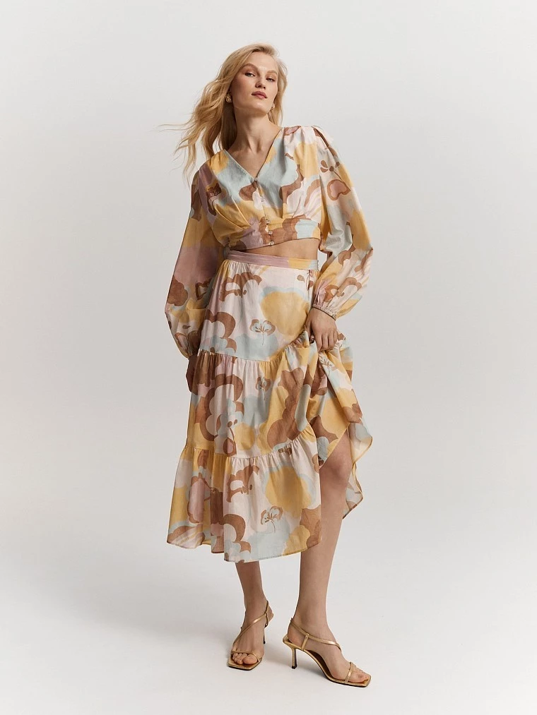 Многоярусная юбка с высокой посадкой в длине миди выполнена из тонкого батиста с пастельным цветочным принтом. Модель полуприлегающего силуэта с расширением к низу, застёжкой на боковую потайную молнию и хлопковой подкладкой. С блузкой из того же материала составит яркий женственный образ.
