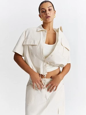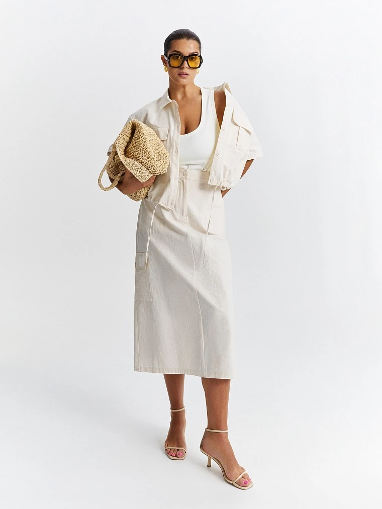 Изящная свободная юбка-карго в светлом молочном оттенке станет незаменимой базой летнего гардероба. Материал хорошо держит форму, пропускает воздух и почти не ощущается на теле. Прямой крой комфортно прилегает к телу, скрывает недостатки и подойдет для любого типа фигуры, а накладные карманы придают образу расслабленный и спортивный вид. Рекомендуем комбинировать с легкой рубашкой из комплекта для создания трендового total look.