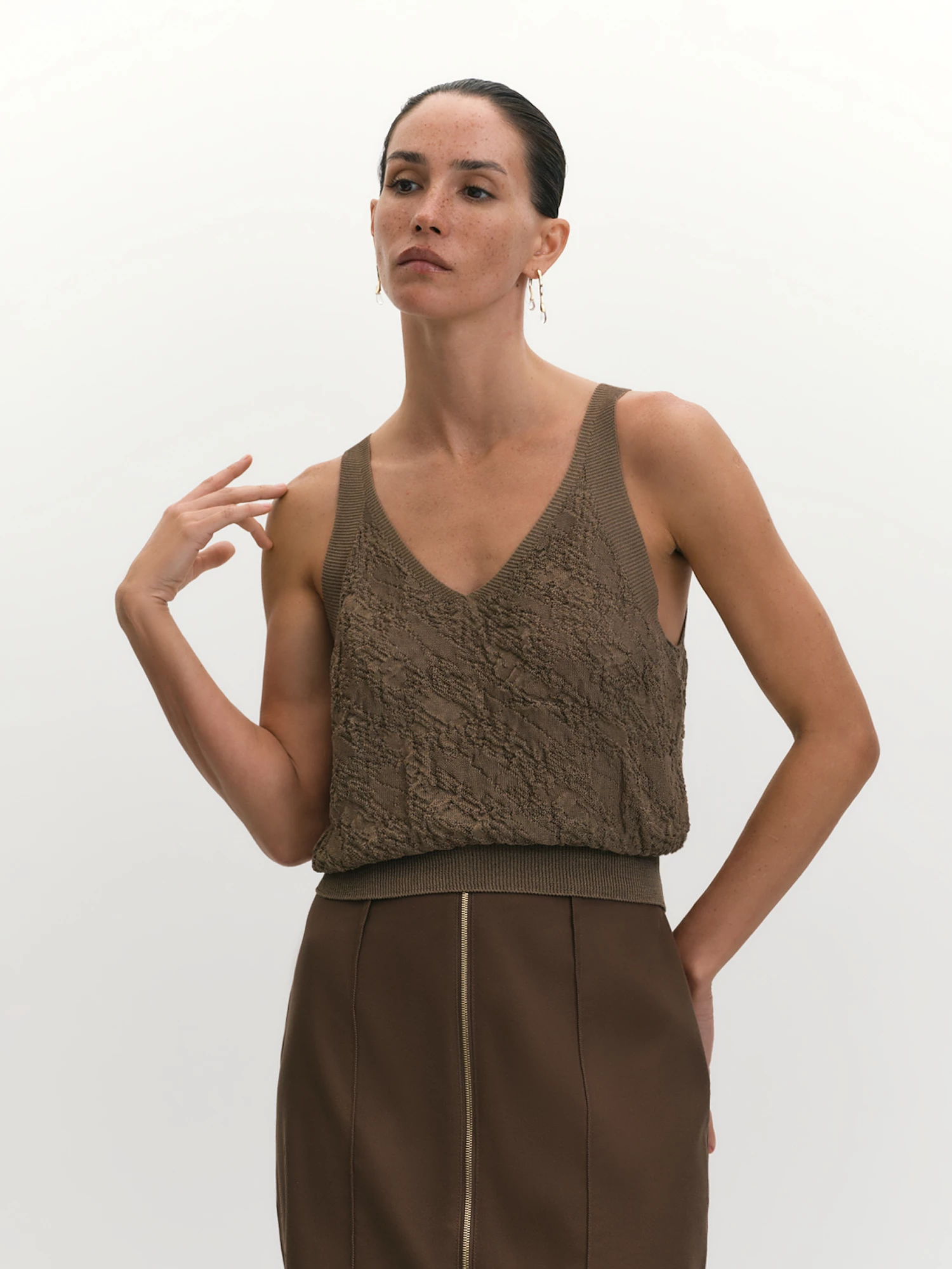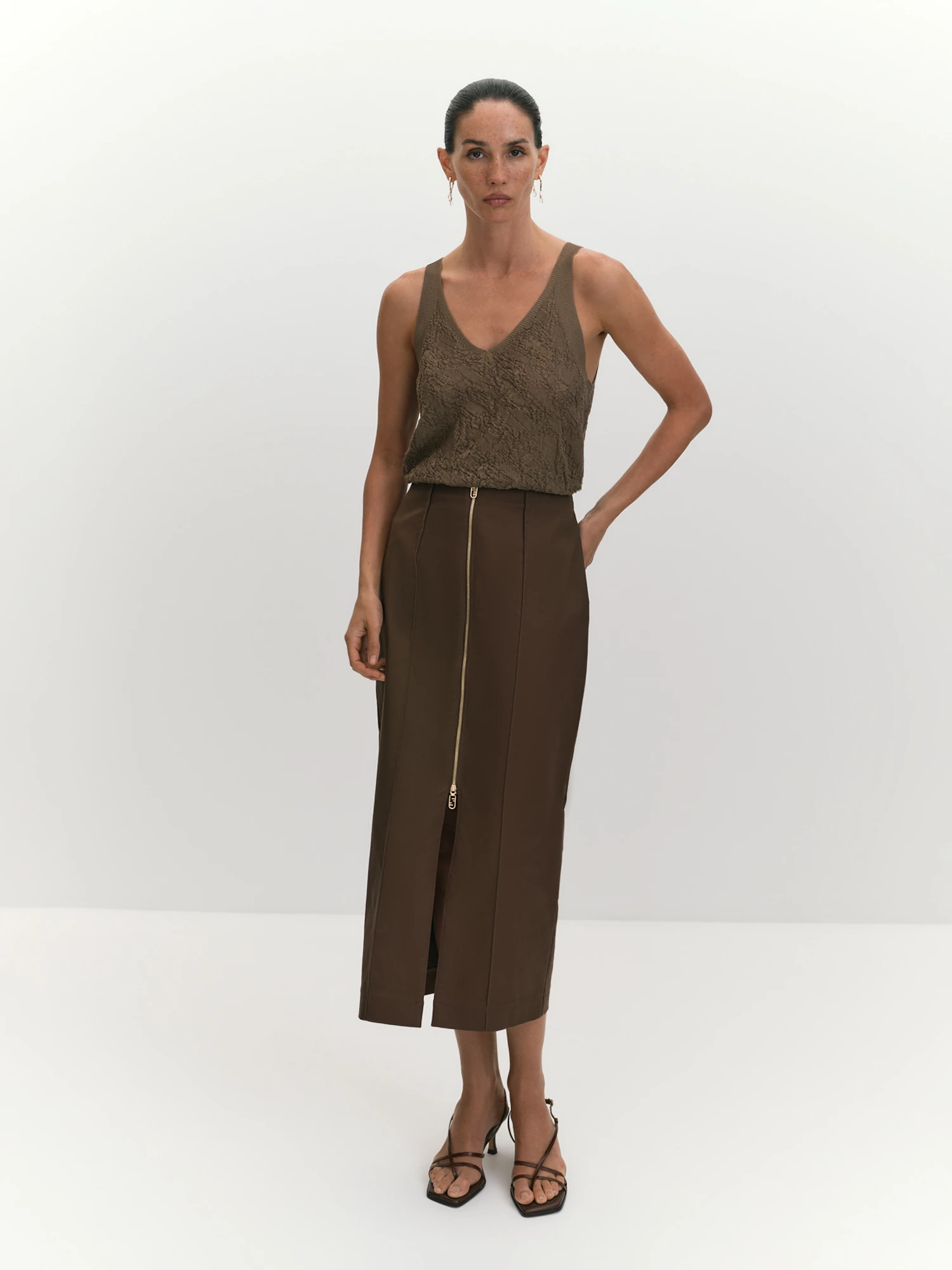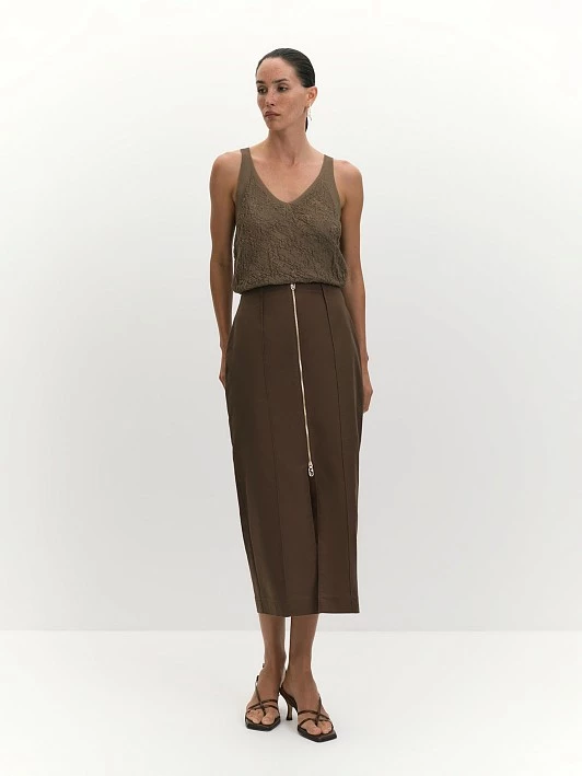 Юбка-карандаш своей высокой посадкой, декоративными вертикальными швами и акцентной застежкой на золотистую молнию — является продуктом эклектики, где современный гламур встречается с элементами классики. Выполнена модель из высококачественной ткани, сочетающей хлопок, модифицированную вискозу и спандекс, такое полотно объединяет в себе прочность, мягкость и эластичность, обеспечивая идеальную посадку, комфорт и свободу движений. Насыщенный оттенок «какао» подчеркивает текстуру ткани и акцентирует внимание на важных деталях, таких как золотистая молния и вертикальные швы, они визуально удлиняют силуэт и придают юбке особую функциональность. Высокая посадка и минималистичный крой создают чистый, структурированный силуэт, подчеркивающий талию и бедра, а застежка на молнию спереди становится не только нужным элементом, но и стильным акцентом, добавляющим образу яркости. Такая юбка легко вписывается в офисные, повседневные и вечерние образы, сочетая в себе удобство, стиль и презентабельность.