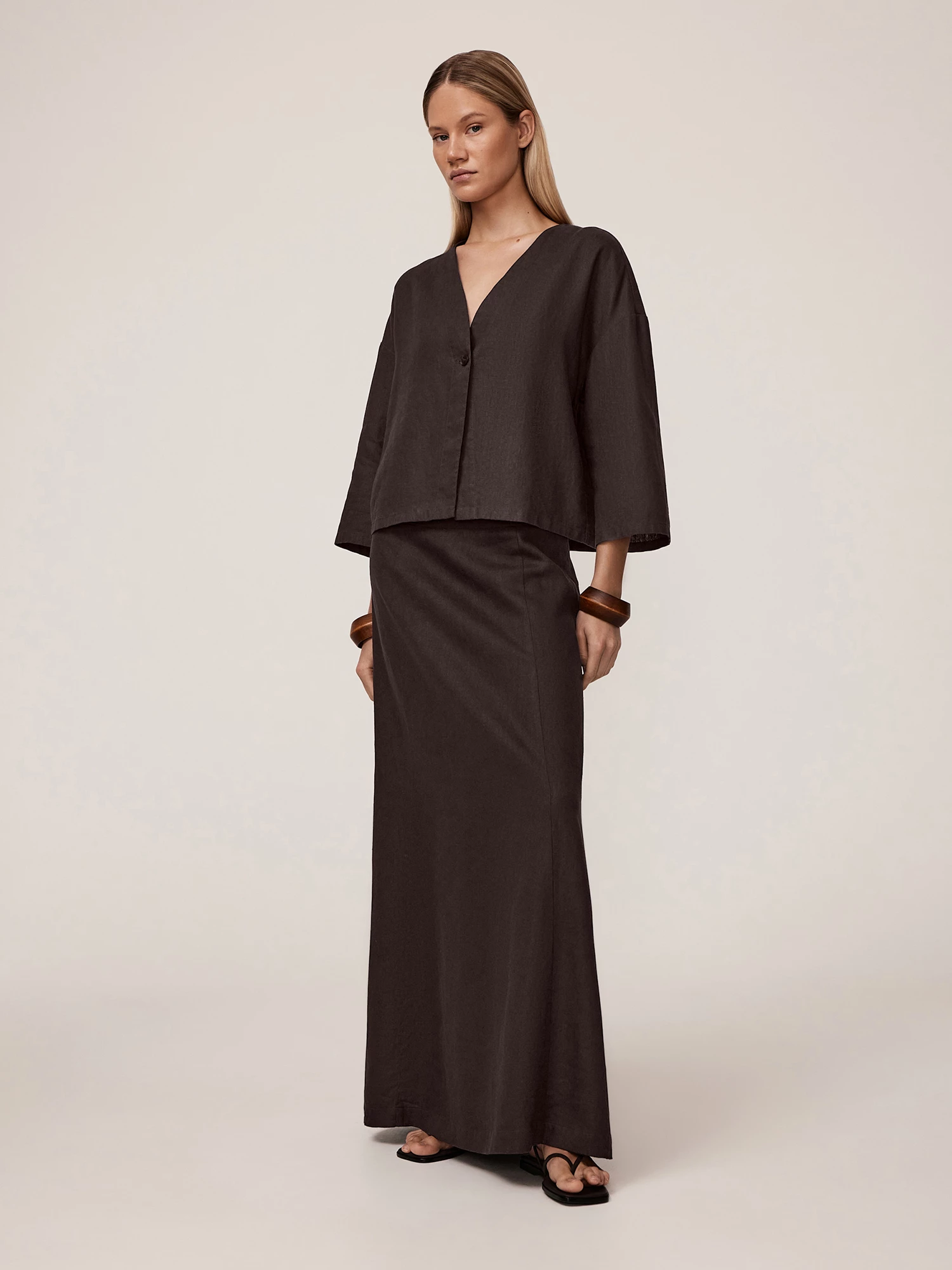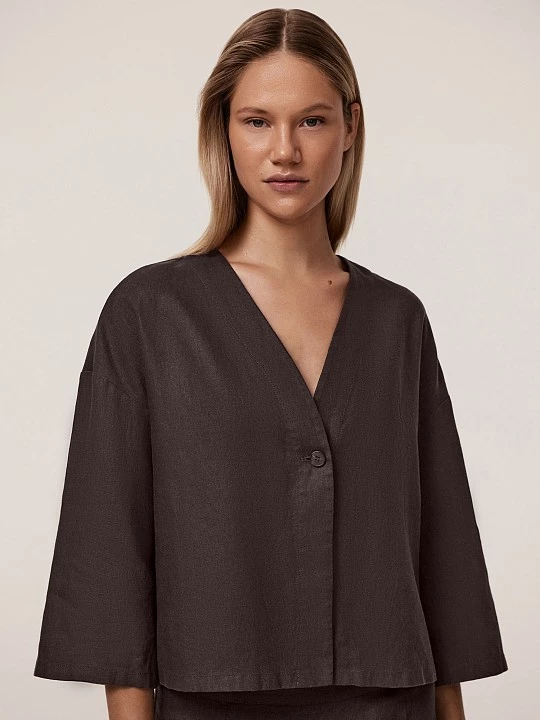Жакет из фактурного льна цвета лакрицы — воплощение элегантности и свободы одновременно. Насыщенный оттенок, напоминающий горький шоколад, придает образу глубину и статусность, оставаясь при этом вне времени. Премиальная натуральная ткань отражает принадлежность модели к направлению "тихая роскошь" с элементами эко-стиля. Помимо презентабельности, лен обеспечивает экологичность, воздухопроницаемость и комфорт, что делает пиджак приятным для носки в теплое время года. Терморегуляционные свойства такого натурального полотна поддерживают комфортную температуру тела, охлаждая или согревая в зависимости от условий. Спущенное плечо, укороченный рукав и отсутствие подкладки формируют свободный неструктурированный силуэт, что подчеркивает естественную красоту благородного льна и создает ощущение непринужденного комфорта. Геометрическая четкость линий сочетается с современным неформальным кроем, выраженным в однобортной застежке и укороченной длине. Идеальный выбор для тех, кто ценит в одежде качество, внимание к деталям и оригинальный крой.