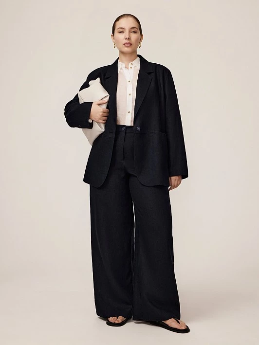 Жакет выполнен в стиле "классический кэжуал». Английский воротник, прямой силуэт и насыщенный цвет отвечают за классическую составляющую, а натуральный лен – за кэжуал и эко-стиль. Модель прямого силуэта комфортна и гарантирует свободу движений, а шлица по низу центрального шва спинки дает возможность комфортной посадки по бедрам. Пиджак отличается оригинальным кроем карманов - в шве подреза по талии выполнено два боковых. Карманы повышают функциональность, добавляя место для хранения мелочей, и подчеркивают лаконичность модели, так как вход в карман практически незаметен. Жакет выполнен из премиальной ткани, на 100% состоящей изо льна. Лен обеспечивает натуральность, экологичность, воздухопроницаемость и комфорт, что делает пиджак приятным для носки в теплое время года. Терморегуляционные свойства такого натурального полотна поддерживают комфортную температуру тела, охлаждая или согревая в зависимости от условий. Выбранный для модели лаконичный и элегантный темно-синий цвет "вулкан" дает неограниченные возможности для создания образов самой разной стилистики.