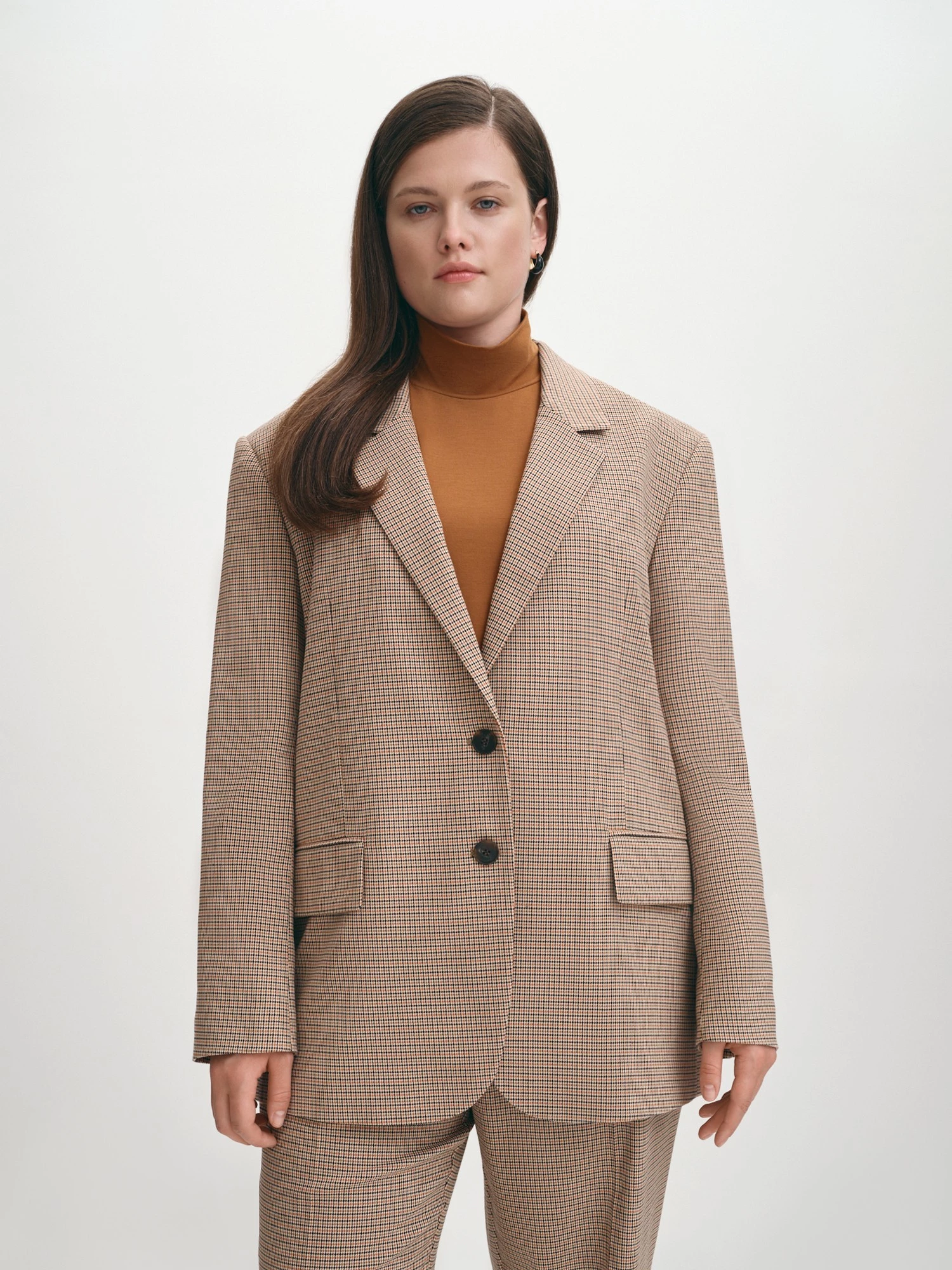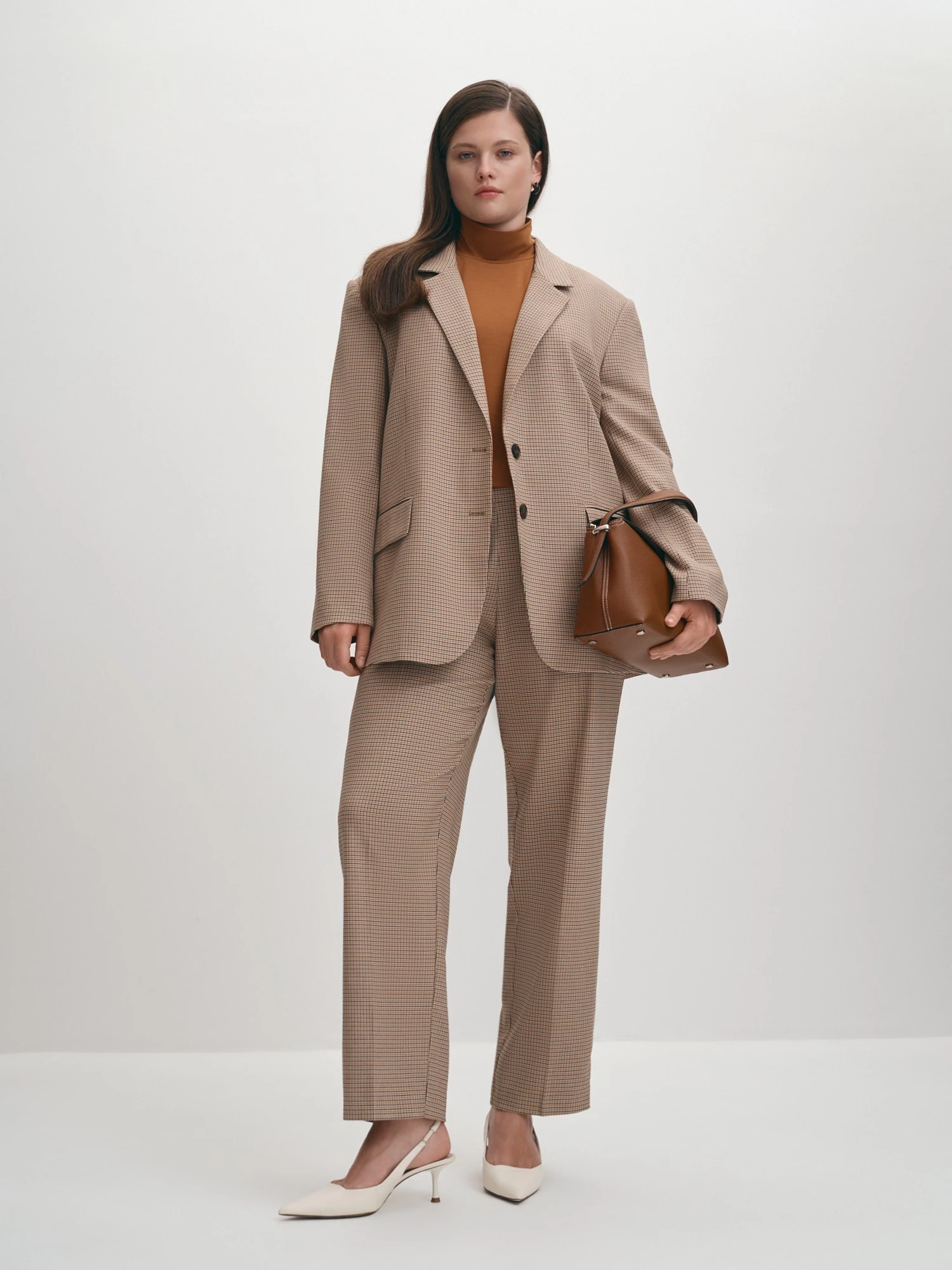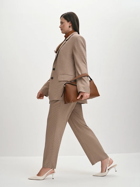 Однобортный жакет классического прямого силуэта из качественной вискозной ткани в бежево-коричневую клетку станет стильным дополнением вашего повседневного образа в прохладную погоду. Модель с классическим воротником и лацканами изготовили полностью на подкладке, дополнив спереди вместительными карманами с клапанами. Моделирующие вытачки и шлица по средней линии спинки обеспечивают комфортную посадку на любой тип фигуры. Если подобрать размер на один-два больше обычного, можно сформировать силуэт оверсайз, он предполагает ношение вещей большого размера, это удобно и стильно. Дополнят образ брюки из того же материала, пиджак с однотонным низом или с костюмными брюками подходит для офиса, школы, прогулки, праздника.