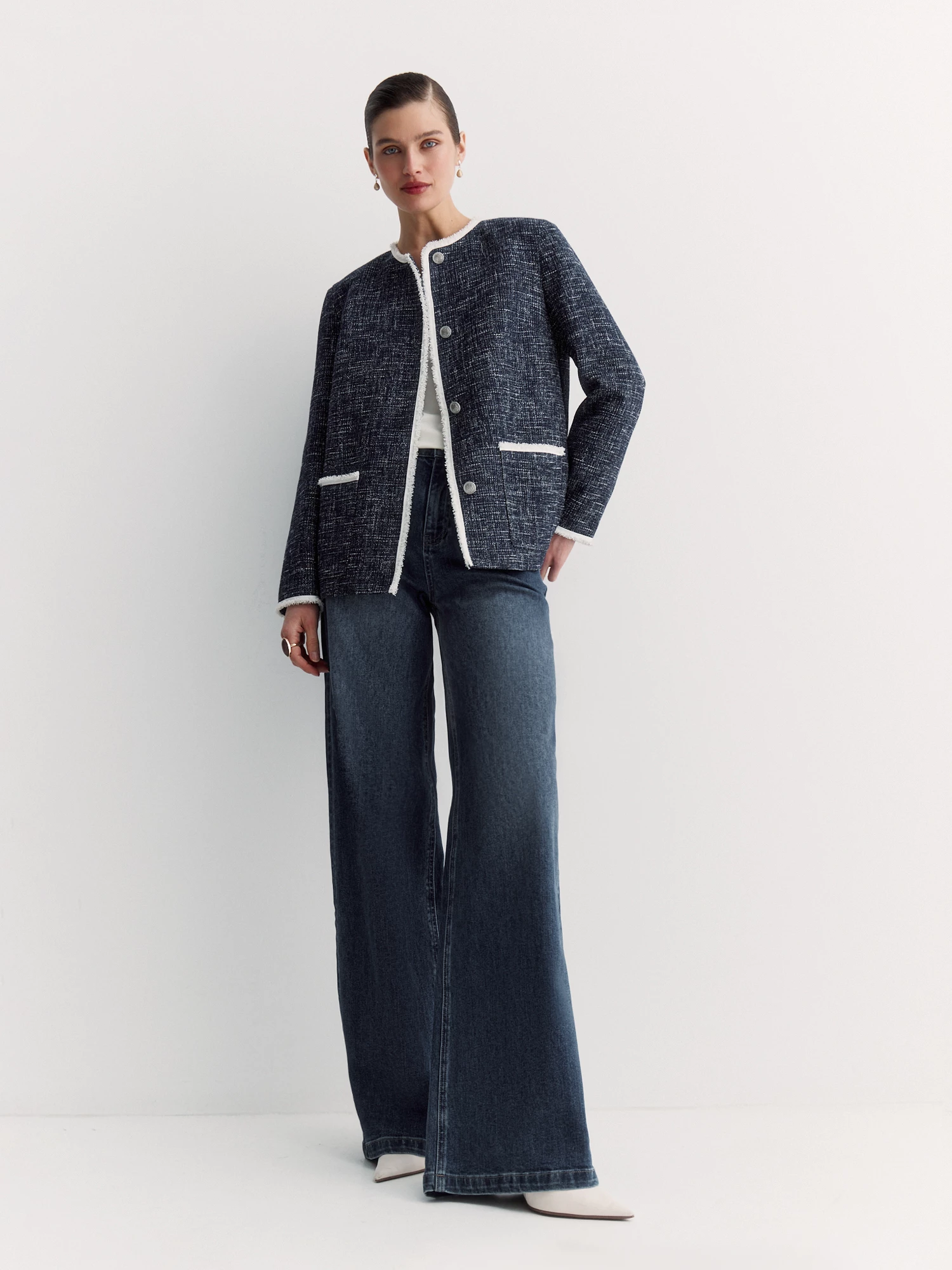Всегда актуальный жакет в стиле Chanel – образец вневременной элегантности. Классический круглый вырез, благородные гербовые пуговицы и стильные накладные карманы создают узнаваемый силуэт. Особый шарм модели придает отделка тесьмой с мягкой бахромой – такая деталь выглядит дорого и изысканно.