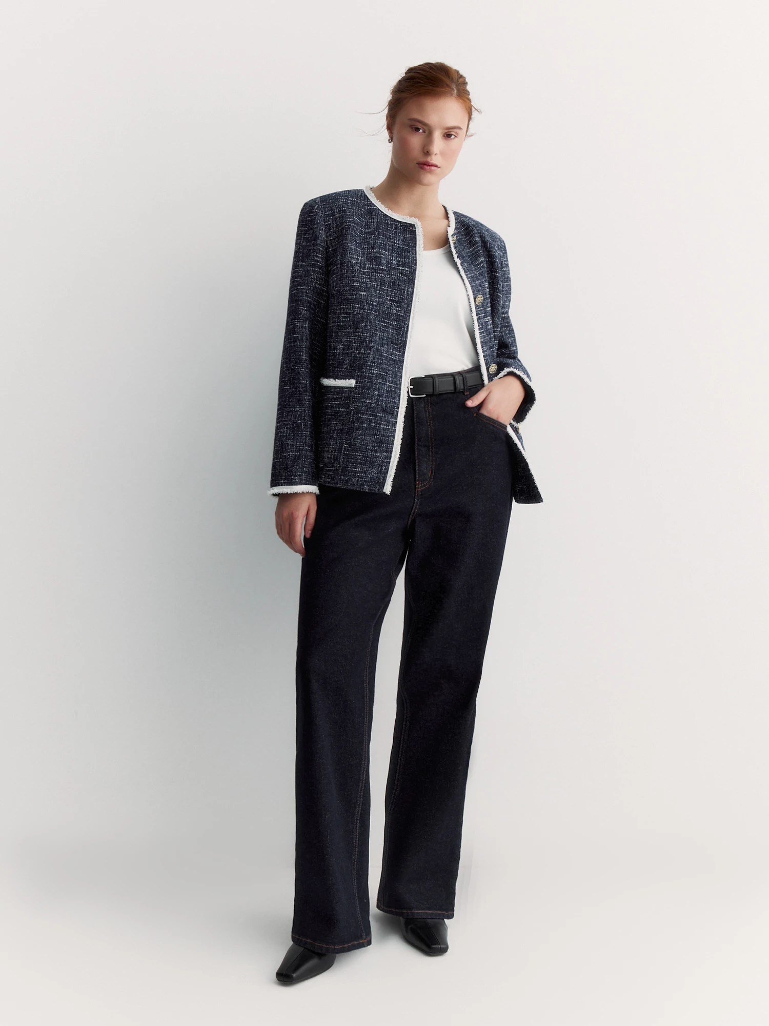 Прямой крой с нагрудными вытачками идеально садится по фигуре, подчеркивая женственные линии. Этот жакет – универсальная база для создания разных образов: наденьте его с классическими брюками для делового стиля, сочетайте с джинсами для smart casual или дополните юбкой-карандашом для вечернего выхода.
