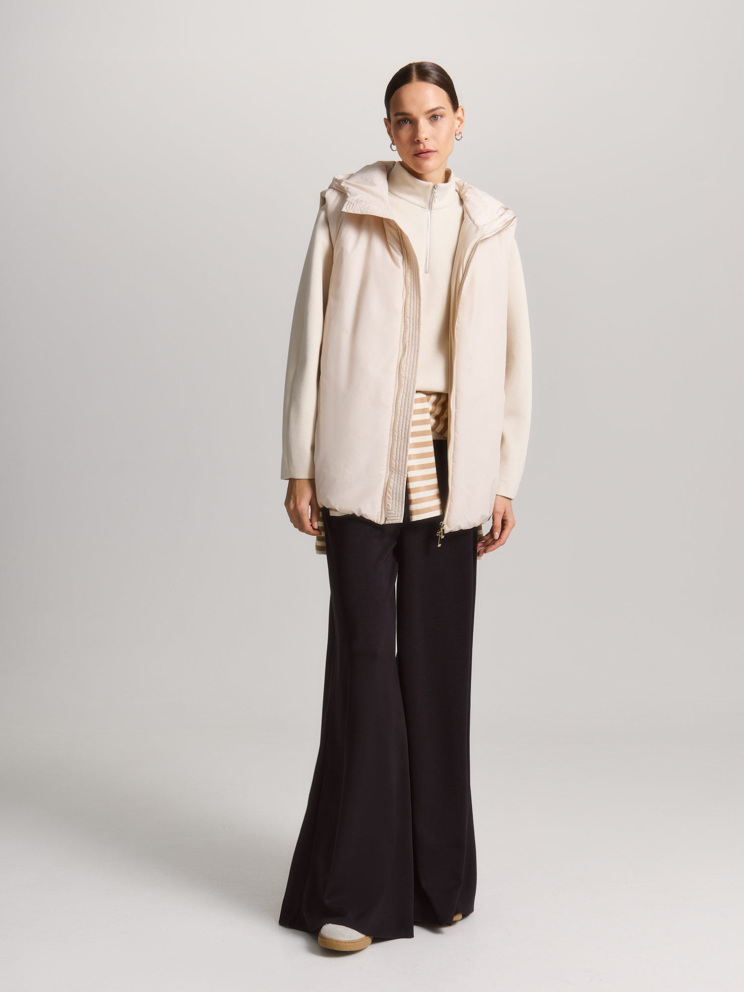 Универсальный светло-бежевый цвет легко сочетается с джинсами и кэжуальными брюками коллекции. Этот жилет станет практичным и стильным элементом Вашего гардероба для прогулок или отдыха, выручит в поездке.